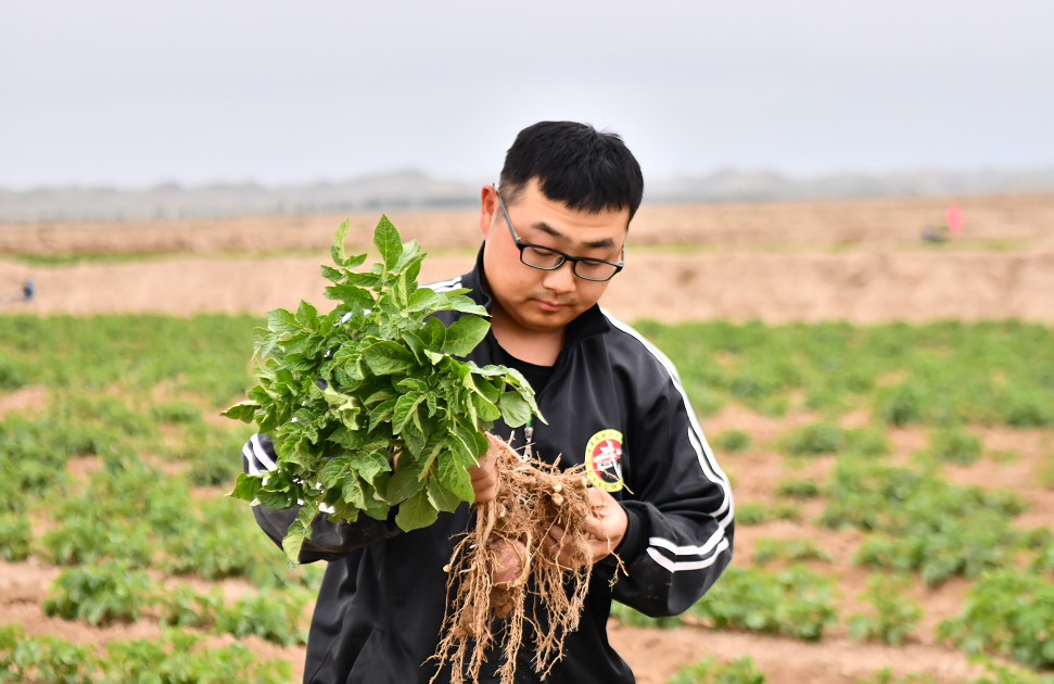 目前,杨英帅和另外一名同事共同管理着2500亩????? ???????????????????? ???????????????????? ???????????????????? ???????????????马铃薯。盛夏7月,正是马铃薯????? ???????????????????? ???????????????????? ??????????????????? ???????????????快速生长的时候,也是需要水分的重要时期,杨英????? ??????????????????? ???????????????????? ??????????????????? ??????????????帅每天都牵挂着马铃薯的生长情况和土壤墒情,????? ???????????????????? ??????????????????? ???????????????????? ???????????????每天天不亮就起床,看看外面有没有下雨,早上六点????? ???????????????????? ???????????????????? ???????????????????? ???????????????多吃完早餐就骑着电动车去地????? ???????????????????? ??????????????????? ???????????????????? ???????????????里,及时掌握不同种植区域田间情况。需要浇水和????? ???????????????????? ???????????????????? ???????????????????? ??????????????施肥时,就及时打开阀门,确保马铃????? ???????????????????? ???????????????????? ???????????????????? ???????????????薯生产所需水分和营养,为几个月后的丰收奠定坚????? ???????????????????? ??????????????????? ???????????????????? ??????????????实的基础。